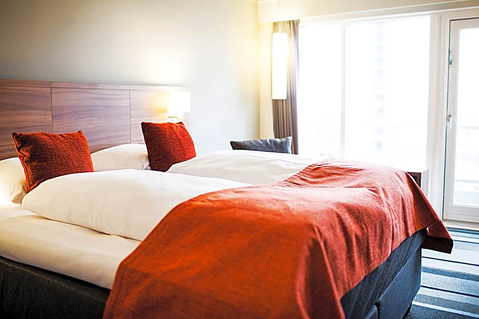 This double room has views of the city of Aarhus, and includes a desk, wardrobe, a TV with Chromecast, tea/coffee facilities, and a private bathroom with a bathtub.